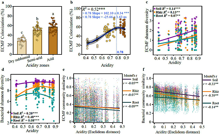 圖:干旱梯度下楊樹菌根定殖情況及其與土壤微生物群落構建的關系