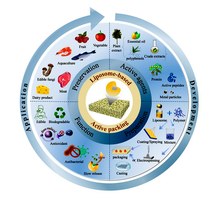本文概述了活性包裝中可被脂質(zhì)體包封的活性物質(zhì)類型,并闡明了這些活性物質(zhì)穩(wěn)定負載于脂質(zhì)體的作用原理;總結(jié)了脂質(zhì)體基活性包裝的制備技術(shù)、作用機制及關(guān)鍵影響因素;此外,還闡明了脂質(zhì)體對包裝材料理化性質(zhì)的積極影響。同時,本文深入探討了脂質(zhì)體基活性包裝在食品保鮮體系中的抗菌、抗氧化機制及控釋原理,并綜述了其在多種食品保鮮中的應(yīng)用效能。通過深入探討,本研究力求為開發(fā)更具創(chuàng)新性、環(huán)保性和高效性的活性保鮮包裝提供解決方案,進而滿足食品工業(yè)不斷發(fā)展的需求。