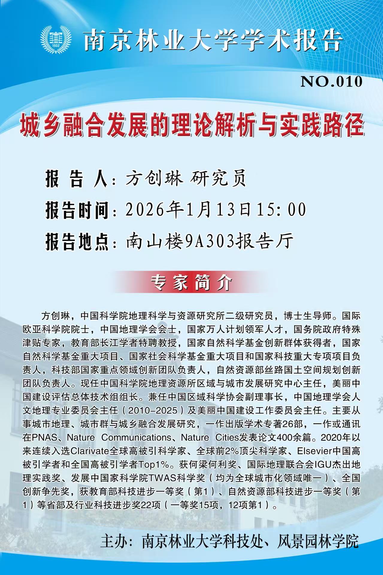 活動(dòng)預(yù)告 首頁 -活動(dòng)預(yù)告 城鄉(xiāng)融合發(fā)展的理論解析與實(shí)踐路徑 來源:通訊員:攝影:【報(bào)告人】方創(chuàng)琳 研究員 【報(bào)告時(shí)間】2026年1月13日15:00 【報(bào)告地點(diǎn)】南山樓9A303報(bào)告廳編輯:瀏覽:時(shí)間:2026-01-12 字號(hào):【大中小】