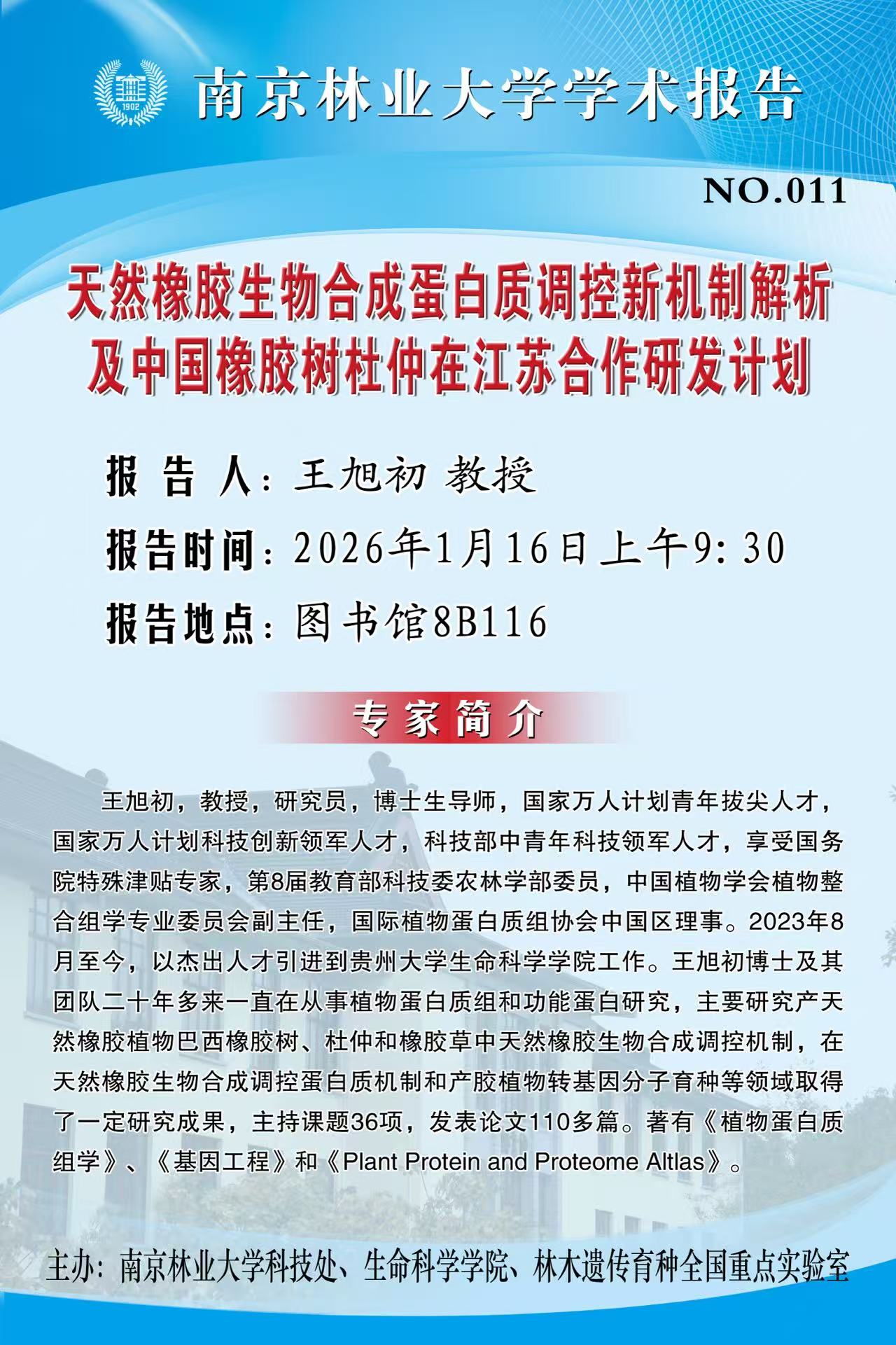 活動(dòng)預(yù)告 首頁 -活動(dòng)預(yù)告 天然橡膠生物合成蛋白質(zhì)調(diào)控新機(jī)制解析及中國橡膠樹杜仲在江蘇合作研發(fā)計(jì)劃 來源:通訊員:攝影:【報(bào)告人】王旭初 教授 【報(bào)告時(shí)間】2026年1月16日上午9:30 【報(bào)告地點(diǎn)】圖書館8B116編輯:瀏覽:時(shí)間:2026-01-14 字號:【大中小】