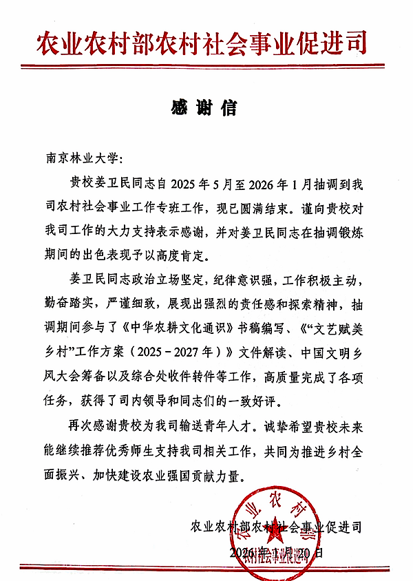 【南林新聞中心訊】近日,我校收到農(nóng)業(yè)農(nóng)村部農(nóng)村社會(huì)事業(yè)促進(jìn)司發(fā)來感謝信,對(duì)由我校中國特色生態(tài)文明建設(shè)與林業(yè)發(fā)展研究院選派的姜衛(wèi)民同志,在抽調(diào)工作期間展現(xiàn)的過硬政治素質(zhì)、扎實(shí)專業(yè)能力和優(yōu)良工作作風(fēng)給予高度評(píng)價(jià),并對(duì)學(xué)校的大力支持表示感謝。